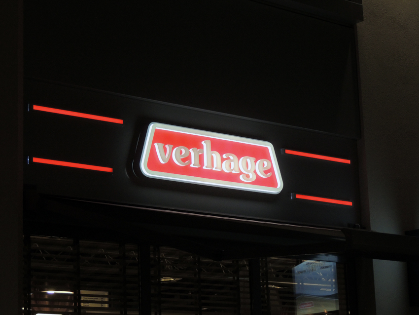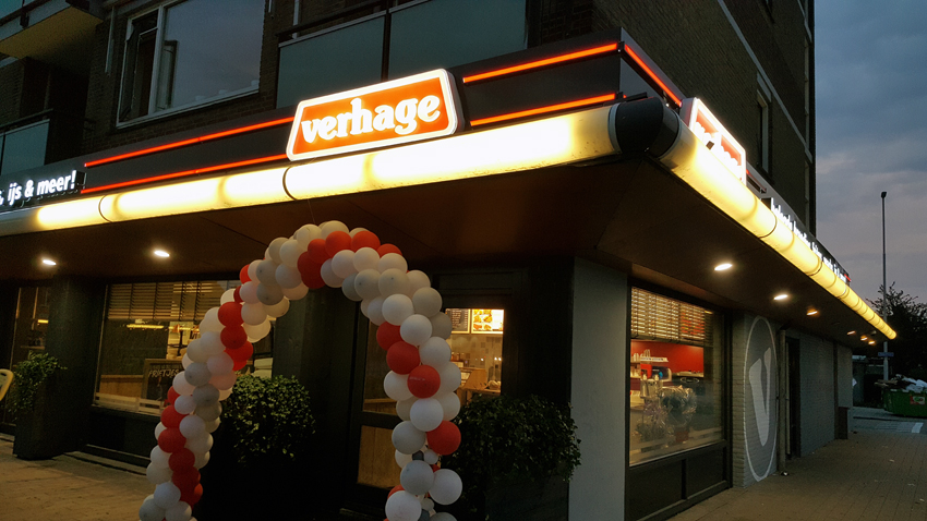 Langzaam maar zeker is de Verhage franchise (met ruim 30 vestigingen) bij ons uitgegroeid tot één van onze grote klanten. Begonnen met een sticker en wat raamfolie, leveren we nu een groot aantal verschillende producten. Freesletters, menuborden, raambelettering en zelfs lichtreclame van een nieuw te openen vestiging komen bij ons vandaan.