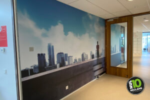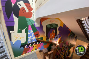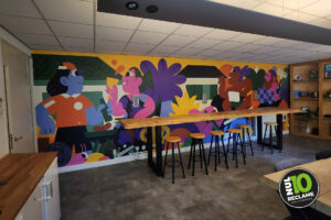 Voor hun kantine en trap mochten we de kleurrijke illustraties van Hedof met behang folie tot leven brengen. Zijn heldere en speelse werk zie je ook wereldwijd terug in reclamecampagnes, kunstinstallaties, muurschilderingen, kleding en producten.