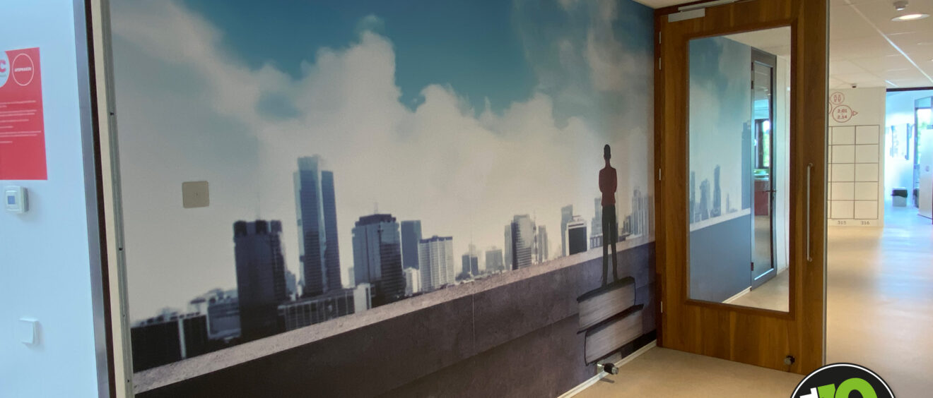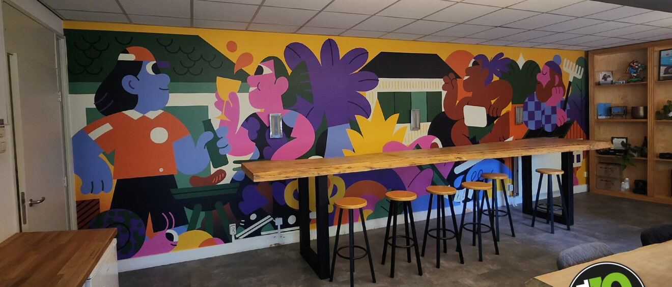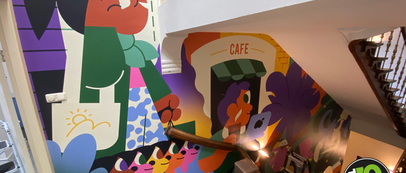 Voor hun kantine en trap mochten we de kleurrijke illustraties van Hedof met behang folie tot leven brengen. Zijn heldere en speelse werk zie je ook wereldwijd terug in reclamecampagnes, kunstinstallaties, muurschilderingen, kleding en producten.